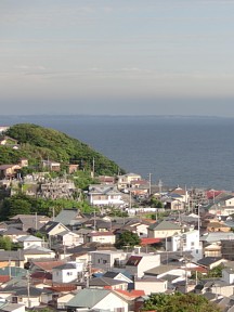 [ 仏舎利塔からの眺め ] そうそう、龍口寺のハイライトはなんと言ってもこの仏舎利塔で、仏舎利塔の階段を登ると湘南の海が見て取れる。 |