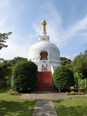 [ 片瀬山公園 ] 今回は、江ノ島周辺の散策コースをご紹介する。まず最初は、湘南モノレールで湘南江の島のとなり目白山下駅の横にある片瀬山公園へと向かう。駅を降りると、すぐ左手に入口あり、園内に入ると緑豊かな丘陵地が広がっている。ただ、残念なことに、高台なのに木々が生い茂り、江ノ島は近くても、その姿は望めない。僅かに、相模湾が見える程度である。それでも、のんびりするには良い場所で、駅で買った缶コーヒーを飲み、しばしくつろいだ。 | ||