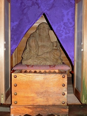 [ 箱根七福神布袋 ] まあ、このままホテルに向かうのも何だし、元箱根港近くのお寺「曹洞宗 瑞龍山 興福院」へ寄り道してみた。境内には白っぽい花を付けた藤棚があり、その横に箱根七福神の一つ布袋尊が祀られている。 〇参考URL:箱根温泉公式ガイド「箱根七福神めぐり」