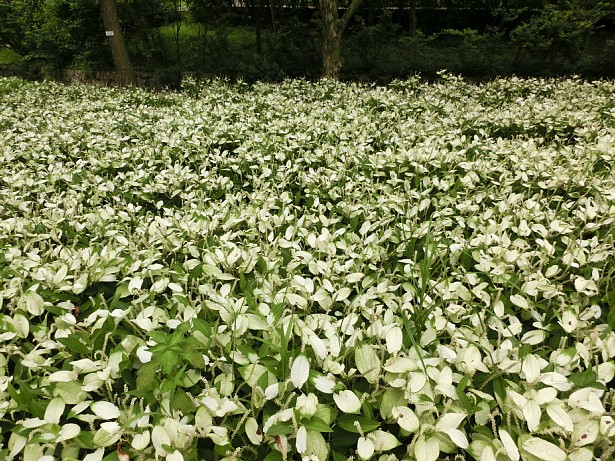 [ 半夏生(ハンゲショウ) ] 余談ながら、6月下旬から7月上旬にかけて、下池にある湿性花園では半夏生の葉が白く色付く。ちなみに、半夏生の名の由来は、花期が半夏生(7月2日前後)の頃からとも、葉が白く色付くため、半化粧をしたような感じになるからとも言われている。 |