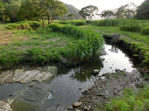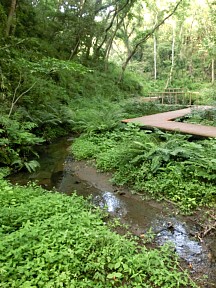そして、川の源流域を抜ければ、小網代の森引橋側入口です。ここから三崎口駅までは徒歩約20分ですが、近くに引橋バス停もありますので、バスで駅まで戻れます。なお、車で行かれる場合、写真右上のとおり、駐車場がありませんのでご注意下さい。それとトイレも、自然環境保全のためありません。トイレは、シーボニア入口バス停から小網代の森へ向かう途中に、水洗の公衆トイレと仮設の公衆トイレの2つがあります。