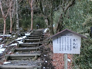 [ 旧街道石畳 ] そして、再びどんどん登って行くと、旧街道石畳というバス停のあるあたり(写真左上)から、昔の街道を感じさせる雰囲気になってきた。石畳の坂を登って行けば、展望広場と休憩広場という二つのビューポイントがあり、植性保護のため入山禁止となっている上二子山や下二子山(写真右上)、さらには駒ヶ岳が望める。ここで一休みした後、再び登ると、やがてお玉ヶ池(「元箱根石仏・石塔群歴史公園とお玉ヶ池」編参照)へ行く道と二つに分かれる。
