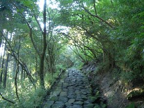 [ 一里塚から ] 箱根旧街道を歩いてみた。出発地点は、前のコーナーでも書いた畑宿バス停で、写真左上から芦ノ湖・元箱根を目指して登るコースである。 まず、バス停から旧街道に入ると、一里塚があり樹木の中を登って行く。途中、何度か車道とクロスしたり車道に沿うような形で歩いて行けば、猿すべり坂バス停に出る。